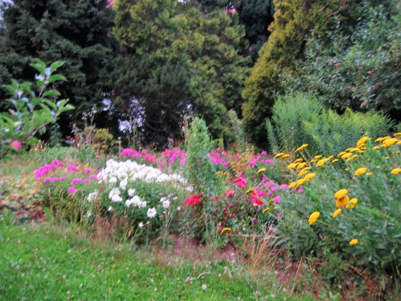 Der Herbst ist in unserem Klostergarten nicht nur eine Zeit der Fülle für Mensch und Tier (ganze Schmetterlingsschwärme laben sich an den Efeublüten, während die Vögel von den Äpfeln und die Eichhörnchen von den Walnüssen stibitzen), sondern auch der Farbenpracht, wenn sich die zarteren Farben der Sommerblumen (die Rosen blühen bei uns bis in den November hinein!) mit den kräftigen Rot- und Gelbtönen des Laubes und der Herbstblüher mischen.