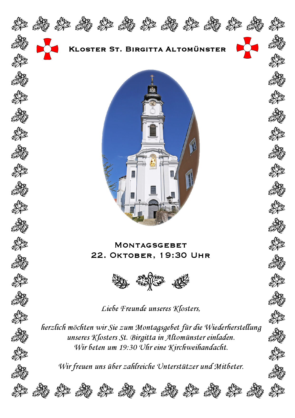 Hier gibt es das Gebet um Erhaltung des Klosters, das wir Anfang Januar 2016 im Zimmer unserer früheren Priorin Mutter Antonia Holzapfel gefunden haben und seither bei jeder Andacht für unser Kloster beten.