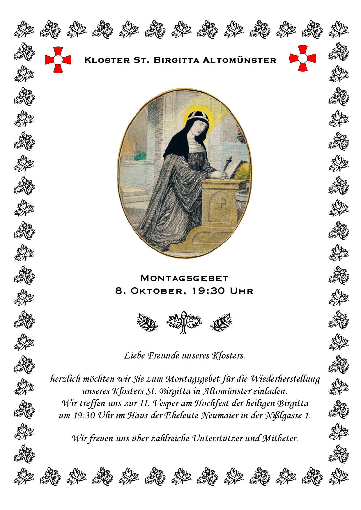 Heute vor 627 Jahren wurde unsere Ordensgründerin Birgitta von Schweden zum ersten Mal heiliggesprochen. Zwei weitere Heiligsprechungen erfolgten vor 603 Jahren und vor 599 Jahren. Dieses Heiligsprechungsdatum war der Grund, warum das Birgittafest jahrhundertelang im Oktober gefeiert wurde, und zwar in der Regel am 8. Oktober, weil am 7. Oktober das Rosenkranzfest begangen wird. Im Zuge der Liturgiereform von 1970 wurde ihr Fest im Generalkalender auf ihren Todestag, den 23. Juli, verlegt. In unserem Orden feiern wir jedoch weiterhin zusätzlich den Heiligsprechungstag als Hochfest. Zu diesem Anlass wollen wir die lateinische Fassung der 2. Vesper zum Hochfest der heiligen Birgitta veröffentlichen, die wir morgen bei unserer wöchentlichen Andacht für die Wiederehrstellung unseres Klosters beten wollen. Wir empfehlen allen Mitbetern, schon einmal zu üben, da die Melodien nicht ganz einfach sind.