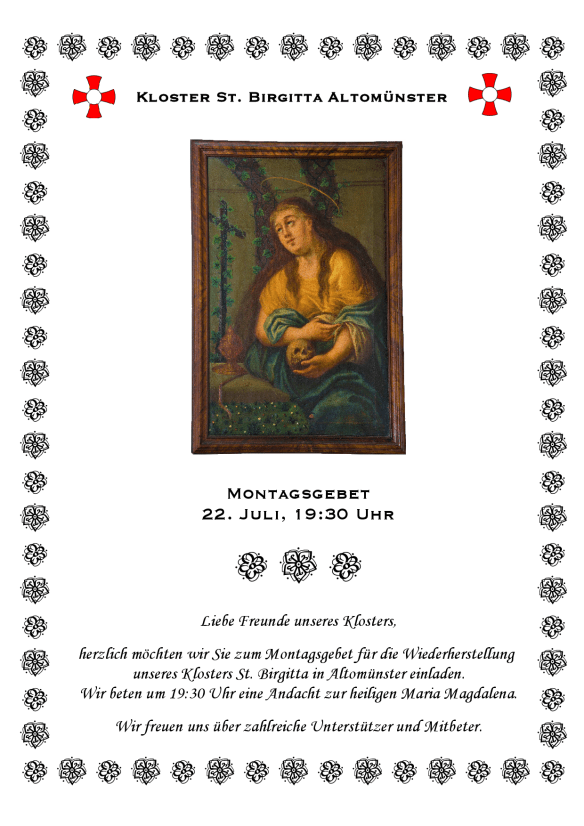 Die Gebete für unsere Andacht zur heiligen Maria Magdalena stehen hier auch als pdf-Datei zur Verfügung.