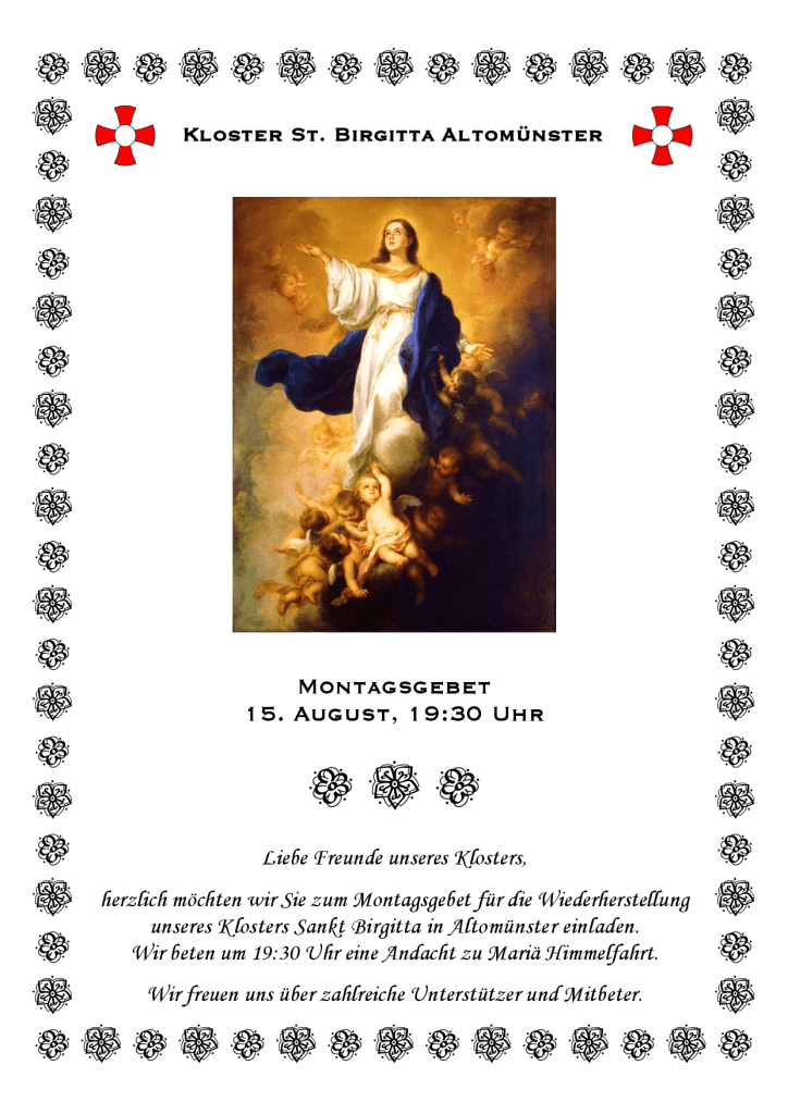 Seit Jahrhunderten vom bayerischen Volke innig verehrt und besonders in den Schrecken des Dreißigjährigen Krieges um Schutz angefleht, wovon noch heute die Mariensäule im Herzen Münchens zeugt, die Kurfürst Maximilian I. als Dank für die Bewahrung der Städte München (wo damals auch unser Konvent Zuflucht fand) und Landshut in diesem verheerendsten aller Kriege auf bayrischem Boden errichten ließ, wurde Maria erst im Ersten Weltkrieg auf Bitten des damaligen Königs Ludwig III. von Papst Benedikt offiziell als Schutzfrau Bayerns bestätigt. Ikonographisch wird sie mit rotem Kleid, blauem, unter dem rechten Arm hindurch nach vorne gezogenen Mantelumhang, offenem Haar, einer großen goldenen Krone, meist in Form einer geschlossenen Bügelkrone oder einer Mitrenkrone, einem langen Szepter in der Rechten und dem einen Reichapfel in der Hand haltenden Jesuskind auf dem linken Arm auf einer schmalen Mondsichel stehend dargestellt.